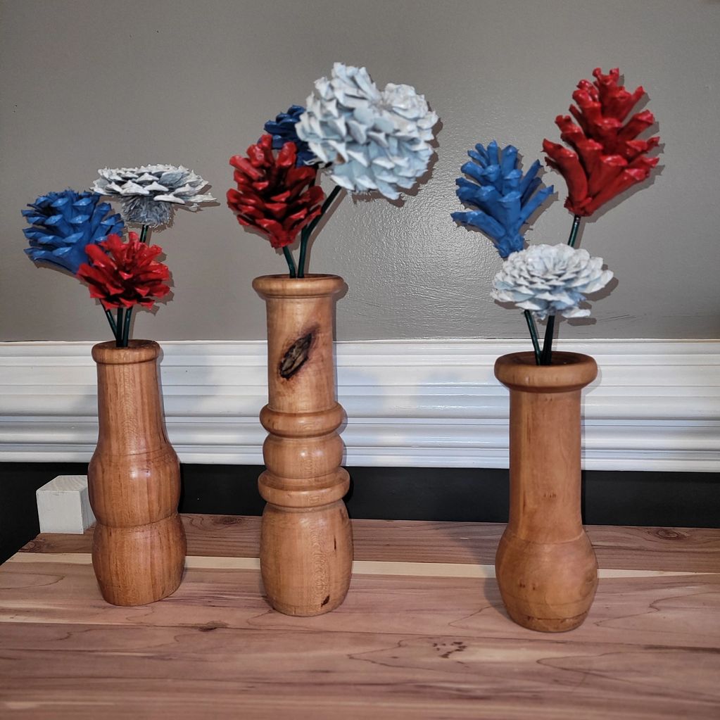 Lathe turned vases with Pinecone flowers